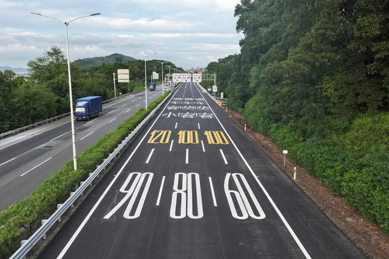 標線工藝也進行了創(chuàng)新,首次采用"熱熔車道邊緣線+雙組份車道分界線"組合工藝,提升標線耐久性。雙組份標線采用A、B兩種獨立組分在施工時按比例混合后,通過化學反應(yīng)噴涂固化形成不可逆的高分子網(wǎng)狀結(jié)構(gòu),提升耐久性和反光性能,延長使用壽命可達3-5年甚至更長。